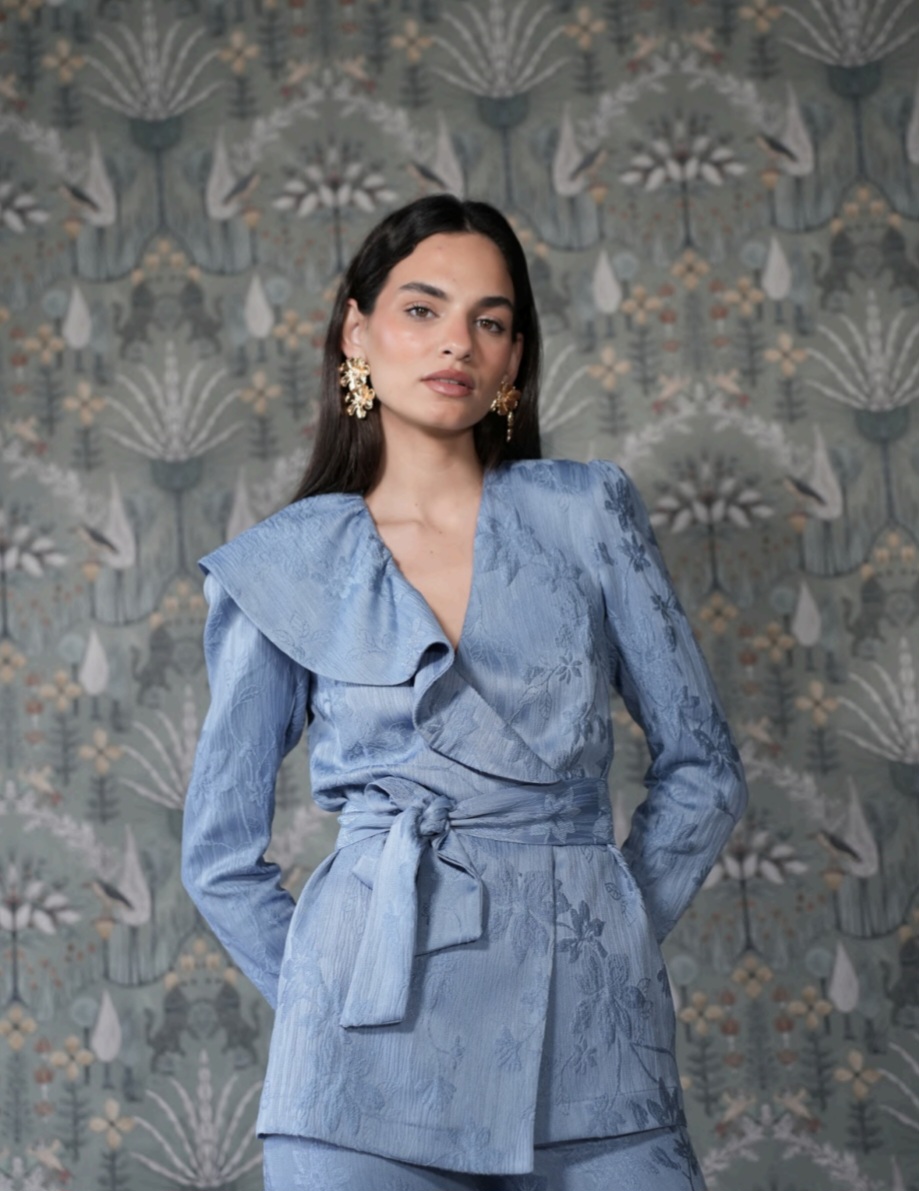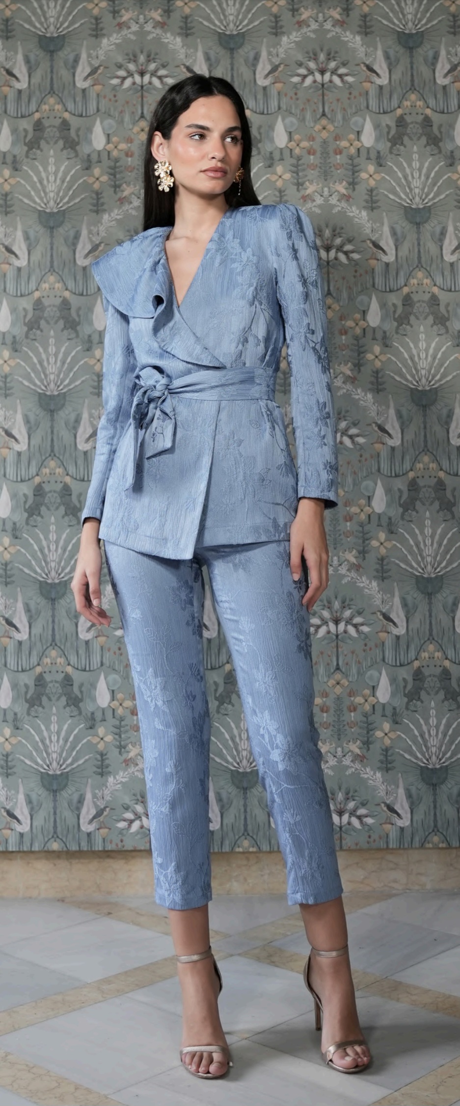 Precioso conjunto de pantalón con chaqueta con detalle de volante en tejido jacquard azul zafiro,estiliza la figura de la mujer y es ideal tanto para invitada como para mamá de comunión, bautizo o fecha especial donde querer brillar por la elegancia. Puedes combinarlo con nuestros complementos y personalizar diadema o pamela a juego